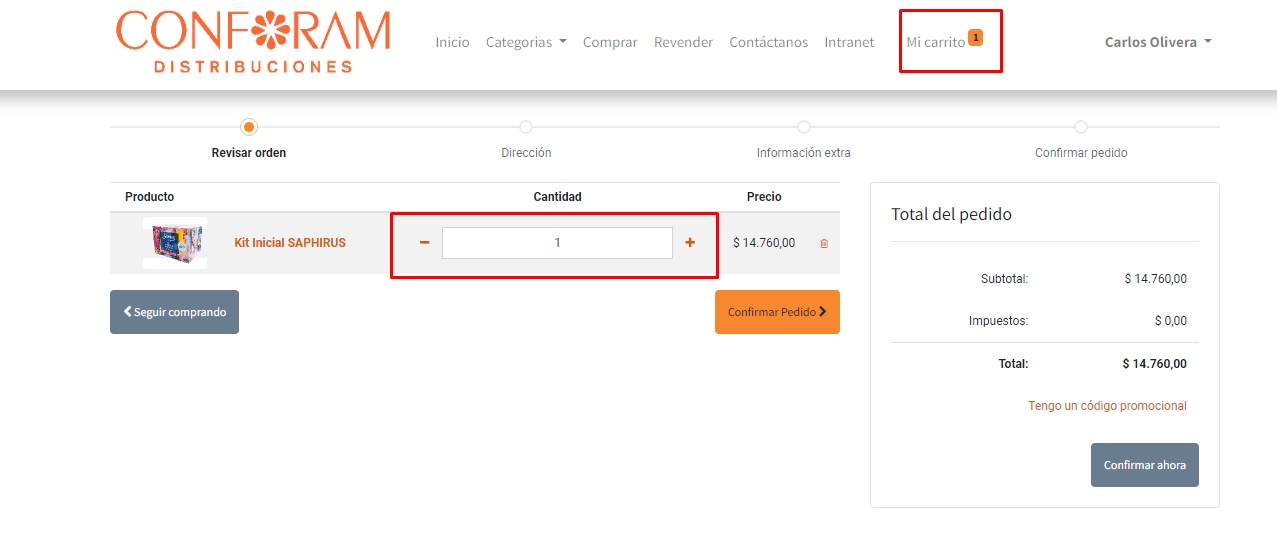 Si ya elegiste tus productos, vas a poder ir al carrito (Mi carrito) donde podras ver el detalle de tu pedido. Aqui podras modificar las cantidades de ser necesario.