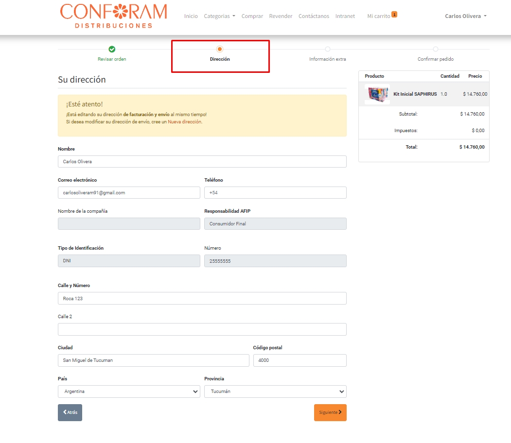 Una vez que hayas finalizado la elección de productos, pasamos a los detalles del pedido. Esto es muy importante ya que con estos datos vamos a poder hacer el envío correctamente. Podes modificar los datos cuando quieras (si necesitas que enviemos a otra dirección). Sino va a tomar la última dirección que registraste. Atención!