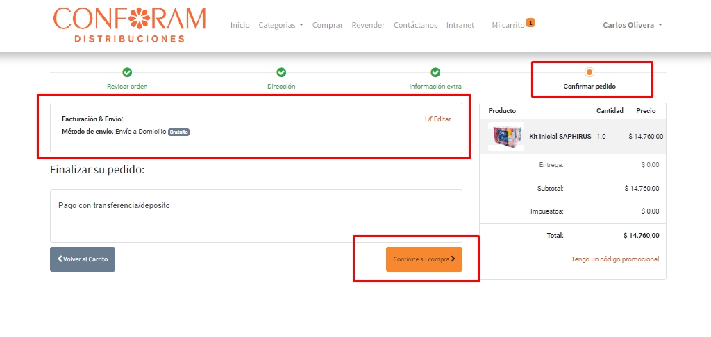 Si ya cargaste los datos y seleccionaste la forma de pago, pasamos a la confirmación del pedido. Aqui podras ver el detalle de tu compra, el metodo de envío y forma de pago seleccionados. Solo falta que apliques al boton Confirme su compra.