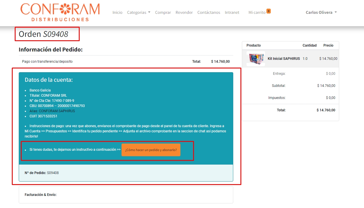 Confirmado el pedido, vas a poder ver el numero de pedido (Orden XXXX) y los datos para hacer el pago en el caso que sea por transferencia o depósito. Podes hacerlo desde el banco, hombanking o cualquier billetera virtual que dispongas. Ademas, si aun tenes dudas de cómo hacer el pago para finalizar el pedido, vas a contar con un acceso directo a este artículo para repasar los pasos (¿Cómo hacer un pedido y abonarlo?).
